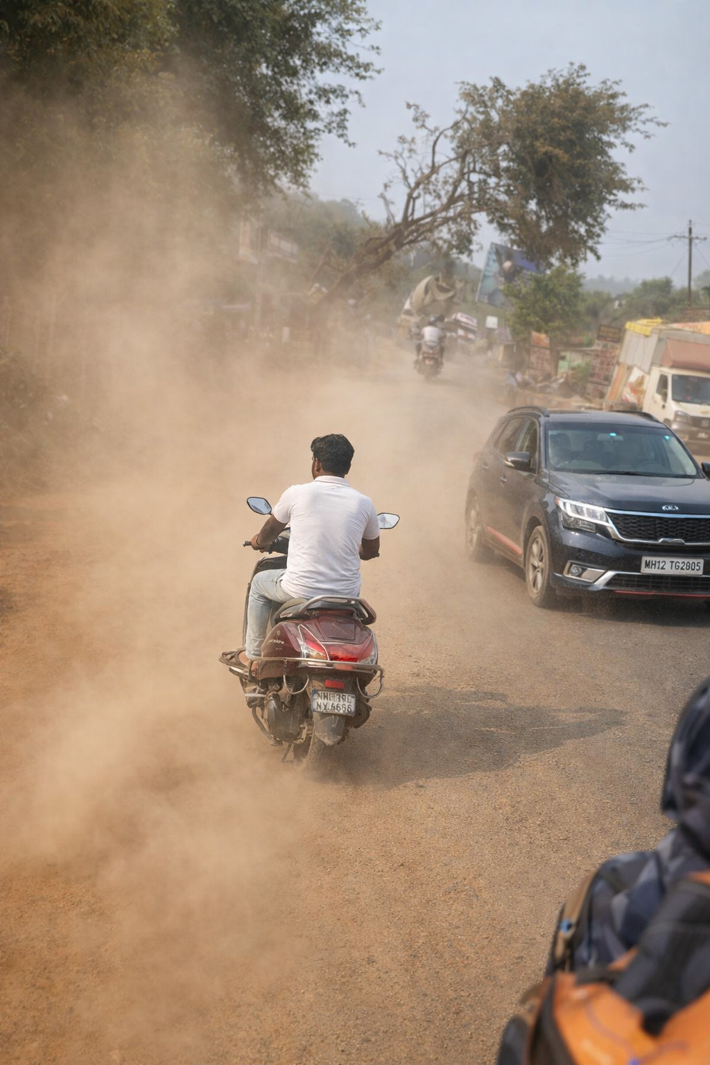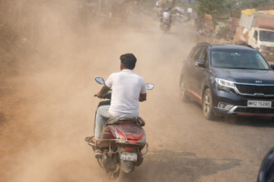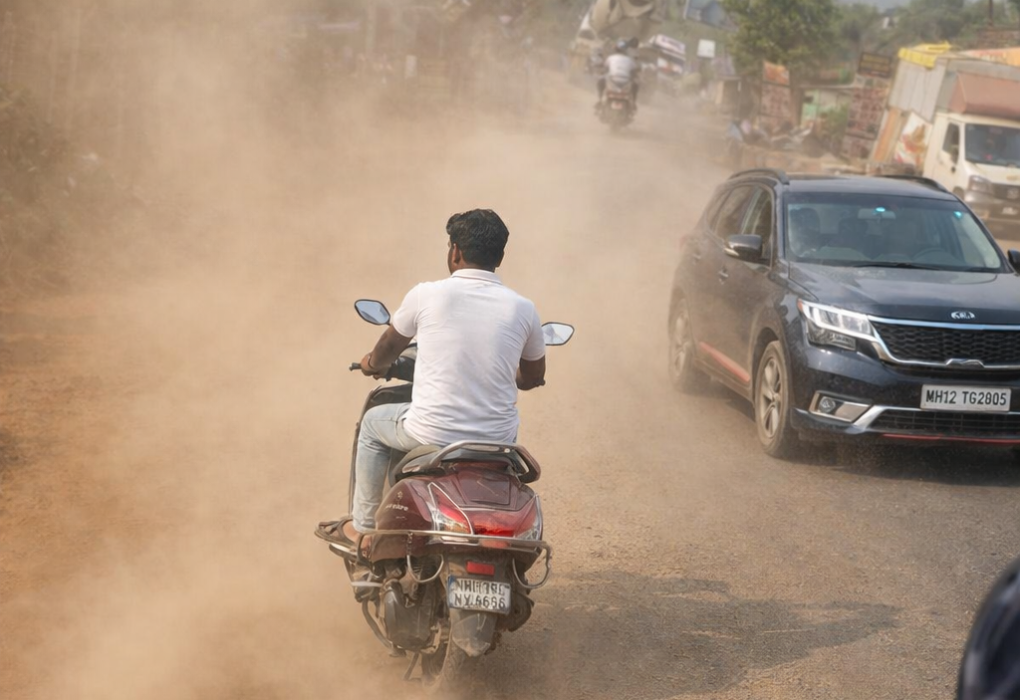 अलिबाग आरसिएफ कॉलनी ते कुरूळ रस्त्यावर धुरळ्याचे लोळ; पर्यटक लोडनंतर नागरिकांच्या आरोग्याचा गंभीर प्रश्न