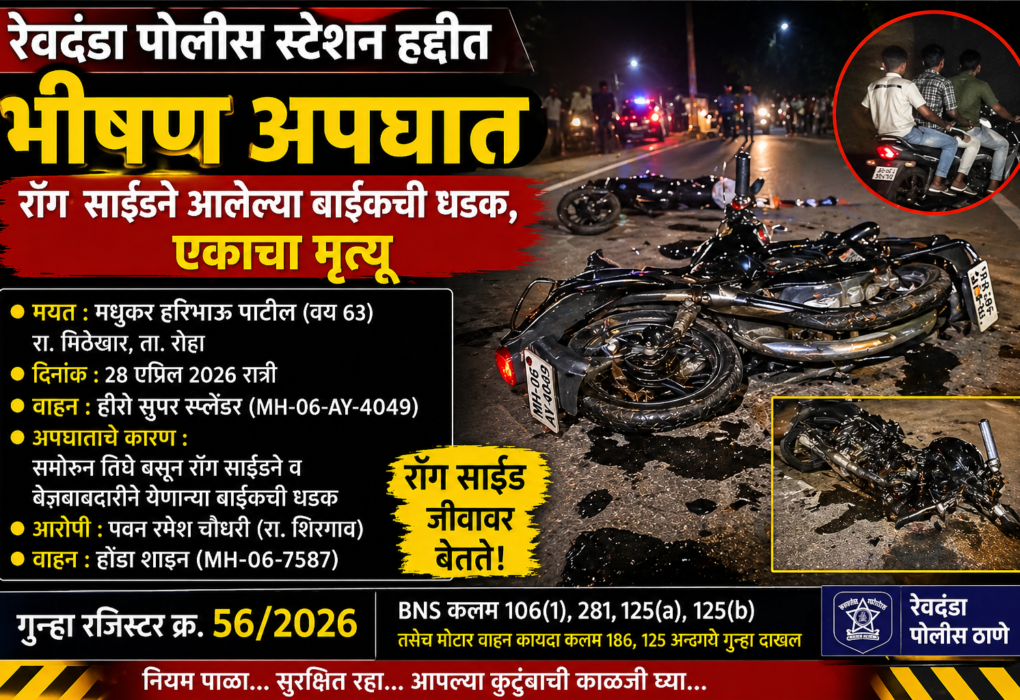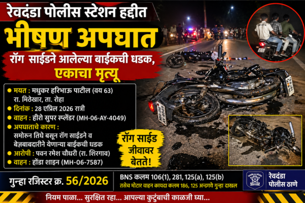 Views: 124 छावा डिजिटल मीडिया न्यूज पोर्टल अलिबाग २१ एप्रिल २०२६ सचिन मयेकर मॅट्रिमोनिअल साईटवर गोड बोलून विश्वास संपादन करणे, लग्नाचं आमिष दाखवणे आणि त्यानंतर लाखो रुपयांची फसवणूक करणे असा धक्कादायक प्रकार समोर आला आहे. या प्रकरणातील आरोपी आदर्श प्रशांत म्हात्रे (वय ३४) हा रायगड जिल्ह्यातील अलिबाग तालुक्यातील…