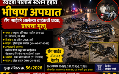Views: 552 छावा डिजिटल मीडिया न्यूज पोर्टल अलिबाग २२ एप्रिल २०२६ सचिन मयेकर अलिबाग येथील समुद्र किनाऱ्यावर आज एक अज्ञात महिलेचा मृतदेह आढळून आल्याने परिसरात खळबळ उडाली आहे. स्थानिक नागरिकांच्या निदर्शनास ही घटना येताच तात्काळ पोलिसांना माहिती देण्यात आली. घटनेची माहिती मिळताच अलिबाग पोलीस…