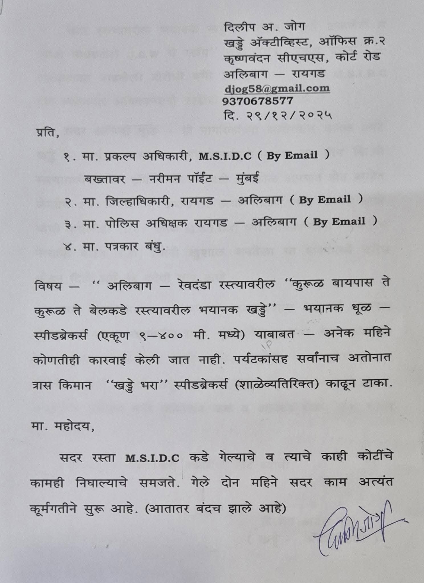 या परिस्थितीवर खड्डे अॅक्टिव्हिस्ट दिलीप अनंत जोग मैदानात उतरले आहेत. त्यांनी २९ डिसेंबर रोजी MSIDC, जिल्हाधिकारी आणि पोलिस अधीक्षकांना तक्रारपत्र पाठवून सात दिवसांत कारवाई न झाल्यास रस्ता रोको व लाक्षणिक उपोषण करणार असल्याचा इशारा दिला आहे. त्यांच्या पत्रात म्हटले आहे की रस्ता MSIDC कडे गेल्याचे समजते, कोटींचे काम मंजूर झालं पण दोन महिने काम कासवगतीने, आता तर थांबले. रस्त्यावर उखडलेले JSW स्लॅग धुळीत रूपांतरित झाले असून नागरिकांच्या आरोग्यास गंभीर धोका निर्माण झाला आहे. कुरुळ बायपास ते बेलकडे या काही किलोमीटर पट्ट्यात अवैध आणि शास्त्रोक्त नसलेले स्पीडब्रेकर्स बसवले गेले आहेत. खड्डे आणि अर्धवट कामामुळे वाहतूक सतत मंदावते, काही किरकोळ अपघात घडत आहेत. रस्त्यालगत वाढलेली झुडपे हटवली गेलेली नाहीत. सर्वात वाईट बाब म्हणजे अधिकारी शांत आणि लोकप्रतिनिधीही मौन. जनतेला हालांमध्ये टाकून त्यांना शरमही वाटत नाही, असा आरोप जोग यांनी केला आहे.